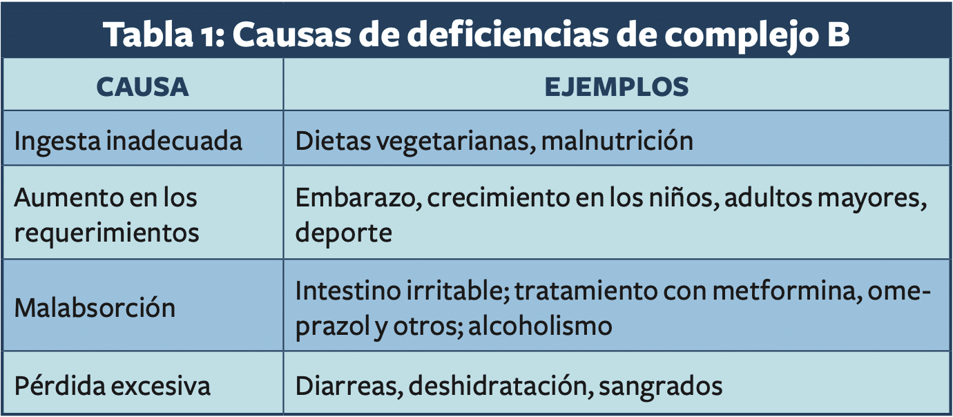 Alrededor del mundo, la deficiencia de complejo B es muy frecuente; en México, 68 % de las mujeres tienen baja ingesta de folatos (B9). Aunque pueden deberse a muchas causas (Tabla 1), las deficiencias de complejo B afectan la calidad de vida de las personas ya que, además de los datos clínicos que se presentan (Tabla 2), los niveles bajos de estas vitaminas se asocian a un peor estado de salud a lo largo de la vida.