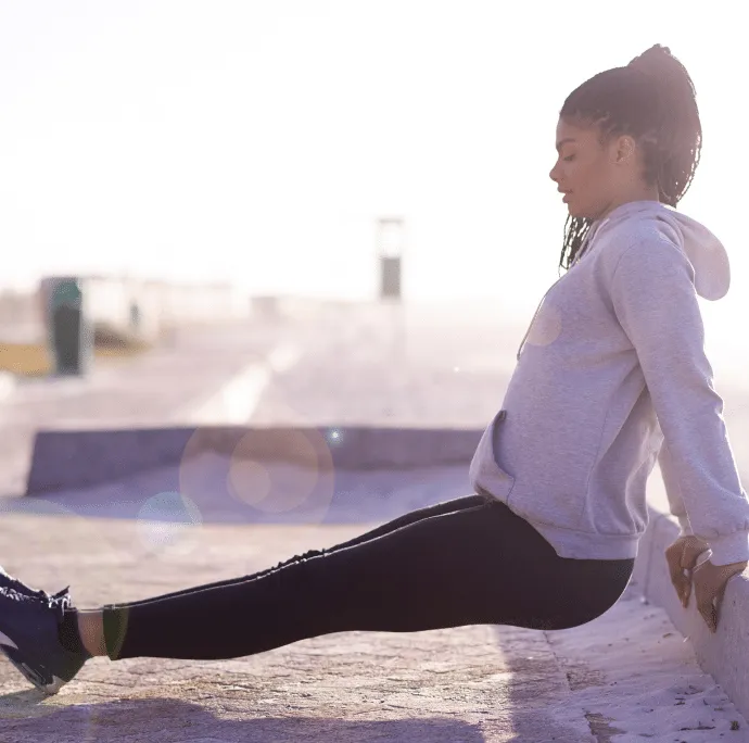 Siéntate en la orilla de una banca de parque (o si estás en interiores, sobre una silla estable) con las manos sos- teniendo la orilla del asiento a cada lado de la cadera. Dobla las rodillas en un ángulo de 90 grados, con los pies plantados sobre el suelo. Deslízate afuera del asiento y mueve los pies ligeramente hacia enfrente, conservando el ángulo de 90 grados en las piernas.